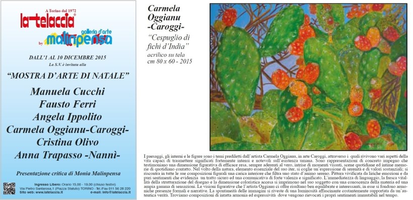 La mostra d’Arte di Natale si terrà dall’1 al 10 dicembre 2015 presso la Galleria d’arte La Telaccia di Torino con orario feriale dalle ore 15,00 alle 19,00 (v. Dépliant della mostra).