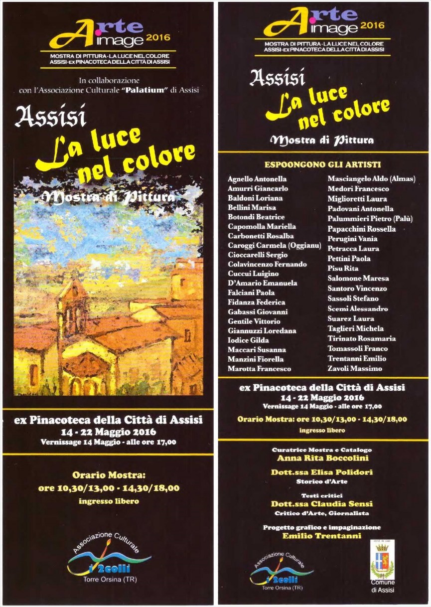 La mostra La mostra “La luce nel colore 2016” verrà inaugurata alle ore 17:00 di sabato 14 Maggio, con presentazione critica delle dott.sse Claudia Sensi ed Elisa Polidori, presso l’Ex Pinacoteca della città di Assisi e resterà aperta al pubblico fino al 22 Maggio.