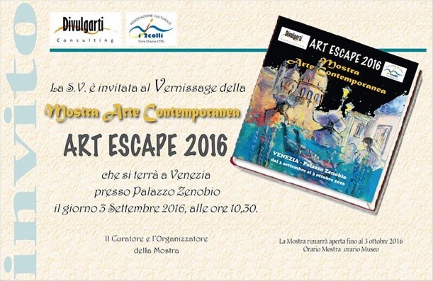 La mostra “Art Escape 2016” verrà inaugurata alle ore 17:30 di sabato 3 Settembre nella nota location veneziana di Palazzo Zenobio (v. Invito al Vernissage). La manifestazione sarà aperta al pubblico fino al 3 Ottobre in orario di museo.