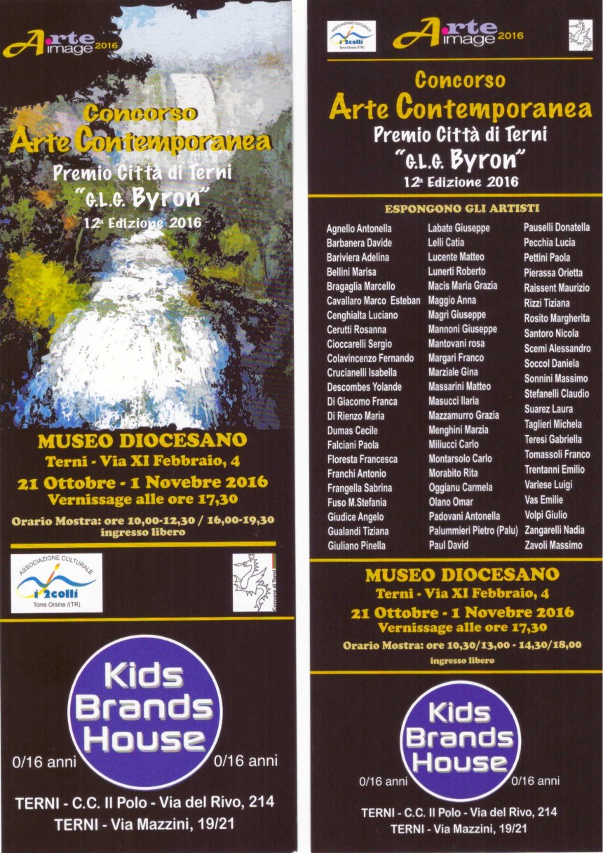 La 12ª edizione della mostra “Premio Città di Terni 2016” verrà inaugurata alle ore 16:00 di sabato 21 Ottobre presso il Museo Capitolare Diocesano (v. Invito al Vernissage), con la partecipazione dei critici d’arte Elisa Polidori, Francesco Santaniello e Claudia Sensi. La manifestazione resterà aperta al pubblico fino al 1° Novembre in orario di museo.