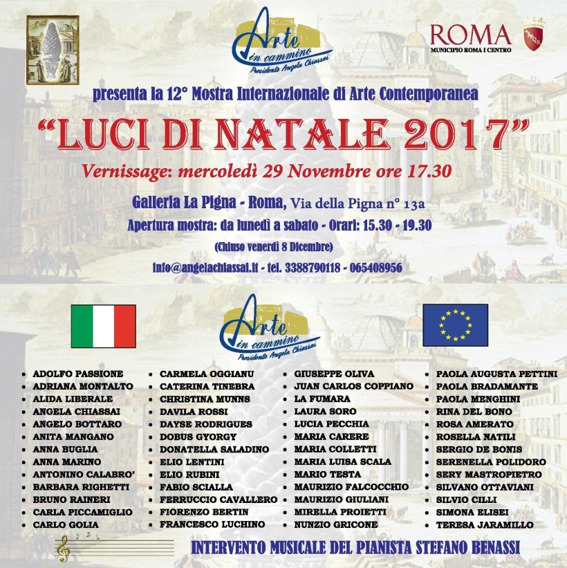 La mostra “Luci di Natale 2017” verrà inaugurata mercoledì 29 Novembre alle ore 17:30 presso la storica galleria “La Pigna” di Roma alla presenza di personalità della cultura e dell’arte e resterà aperta al pubblico fino all’8 Dicembre dal lunedì al sabato in orario 15:30 – 19:30.