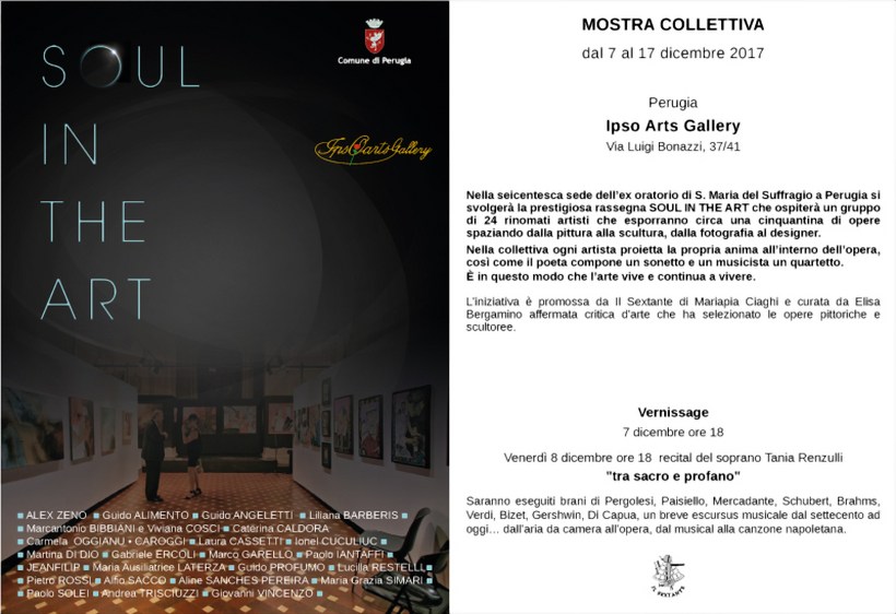 La mostra “Soul in the Art 2017” verrà inaugurata alle ore 18:00 di giovedì 7 Dicembre, con presentazione critica della dott.ssa Elisa Bergamino, presso la “Ipso Arts Gallery” di Perugia e resterà aperta al pubblico fino al 17 Dicembre in orario di galleria. Per venerdì 8 Dicembre, sempre alle ore 18, è in programma il recital del soprano Tania Renzulli dal titolo “Tra sacro e profano”.