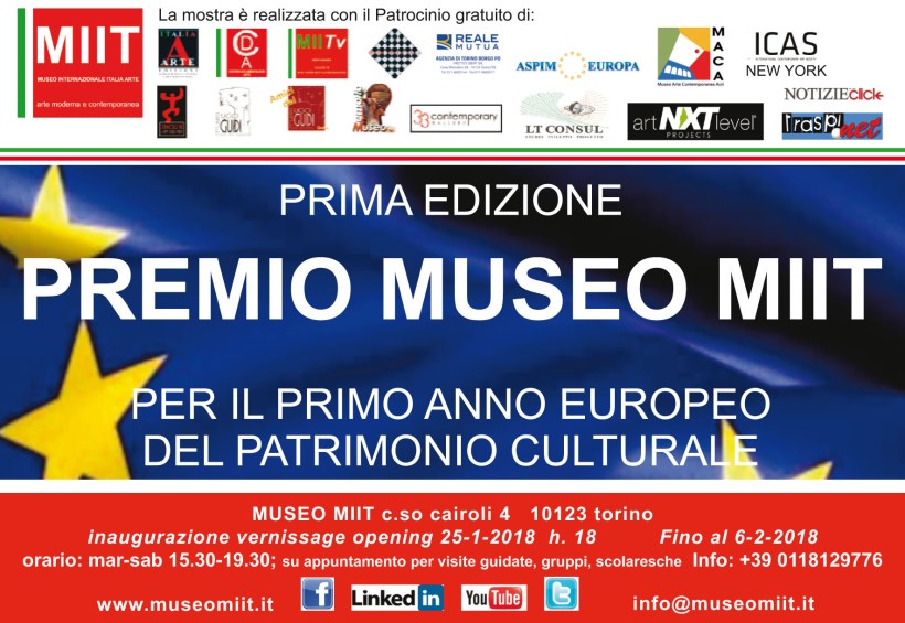 La mostra “Premio Museo MIIT 2018” verrà inaugurata giovedì 25 Gennaio alle ore 18:00 al Museo Internazionale Italia arte di Torino e resterà aperta al pubblico fino al 6 Febbraio (v. Comunicato stampa).