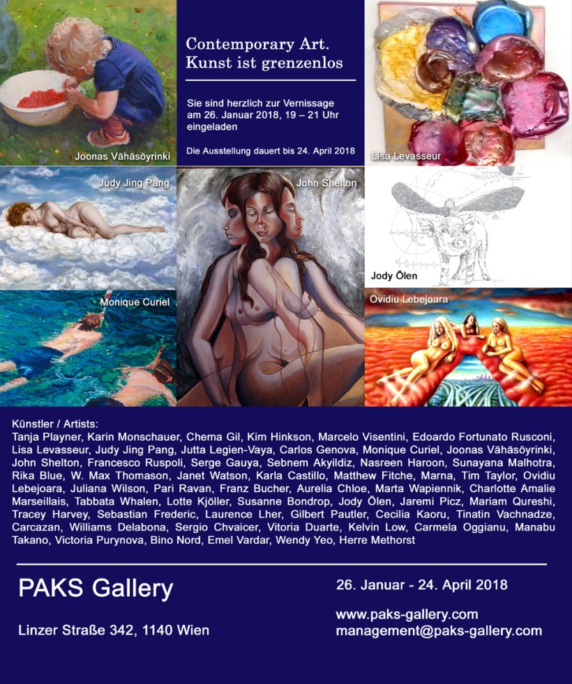 La mostra “Contemporary Art. Hunst ist grenzenlos 2018” verrà inaugurata il 26 Gennaio alle ore 19:00 alla Paks Gallery di Vienna e resterà aperta fino al 24 Aprile in orario di galleria.