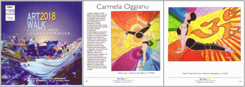 Caroggi partecipa all’evento con le seguenti opere: Chakra yoga (acrilico su tela Gallery 80 x 100h cm, 2017); Costumi di Sant’Antioco (acrilico su tela 70 x 100h cm, 2006); Processione del Venerdì Santo (acrilico su tela 100 x 60h cm, 2017); Saggio di Violoncello (acrilico su tela Gallery 70 x 100h cm, 2017); Yoga: I chakra del cuore (acrilico su tela Gallery 100 x 70h cm); L’albero dello yoga (acrilico su tela Gallery 60 x 80h cm, 2017); Duo di Violoncelli (acrilico su tela 80 x 60h cm, 2017); L’arcobaleno dell’anima (acrilico su tela 80 x 60h cm); Yoga del Sole e della Luna (acrilico su tela Gallery 60 x 80h cm, 2017); Gita in barca (acrilico su tela Gallery 80 x 60h cm, 2015).