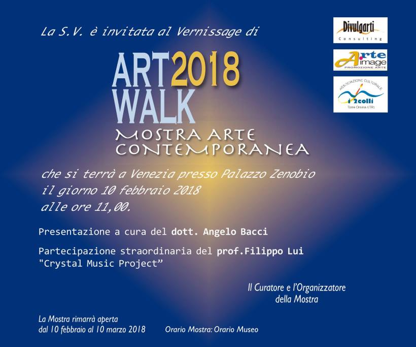 In occasione del Carnevale di Venezia, la mostra “Art Walk 2018” verrà inaugurata alle ore 11:00 di sabato 10 Febbraio nella nota location veneziana di Palazzo Zenobio e resterà aperta al pubblico fino al 10 Marzo in orario di museo.