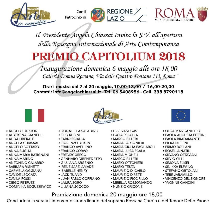 La mostra “Premio Capitolium 2018” resterà aperta al pubblico dal 7 al 20 Maggio negli spazi della Galleria Domus Romana, sita nel centro storico di Roma. Il vernissage è programmato per le ore 18:00 di domenica 6 Maggio, con la presenza dei critici d’arte Mara Ferloni, Vittorio Esposito, Barbara Righetti ed Enrico Cassia.