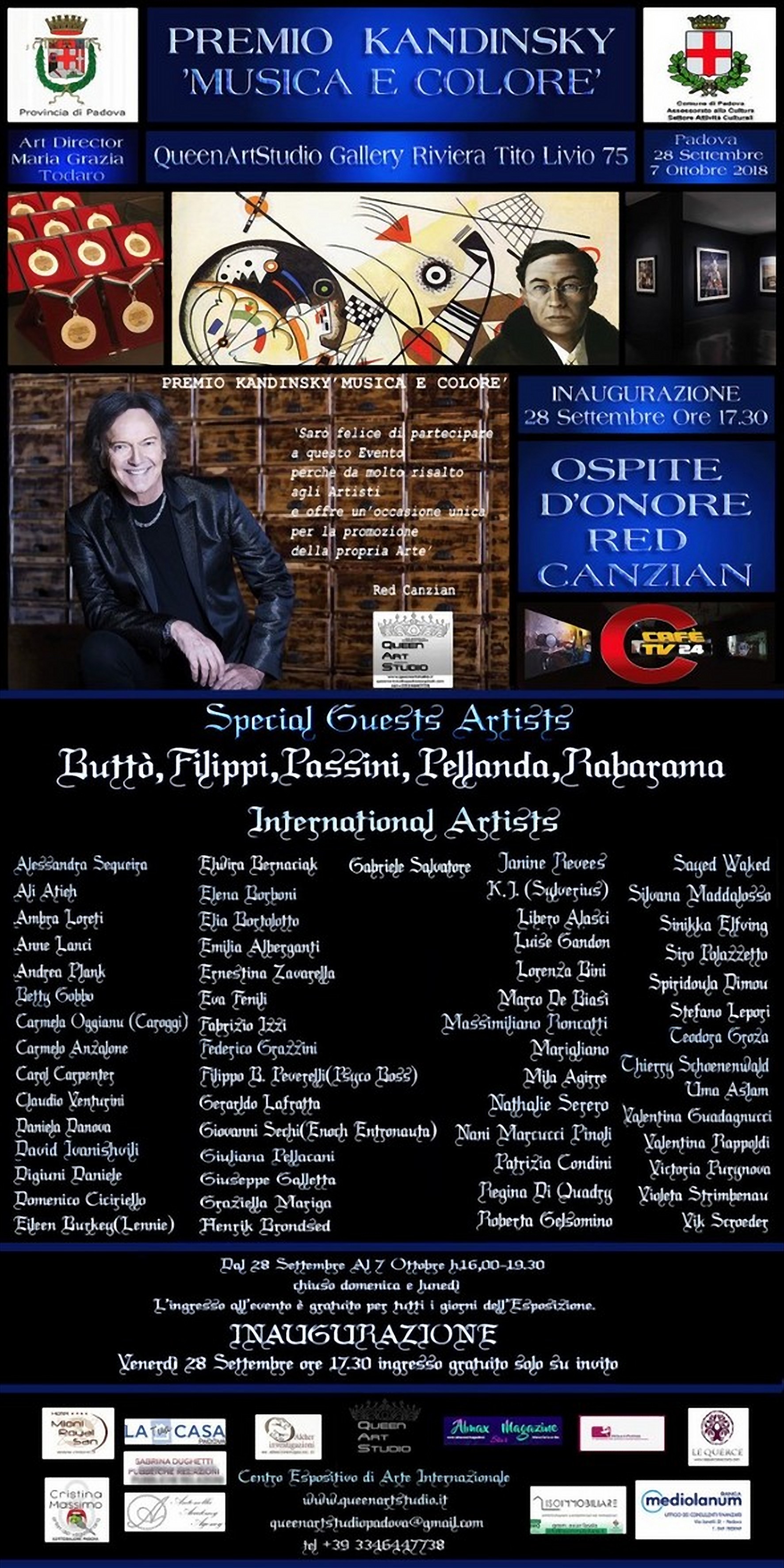 L’evento “Premio Kandinsky” si svolgerà nel cuore della città di Padova dal 28 Settembre al 7 Ottobre 2018, in occasione dell’apertura del nuovo Internazional Art Center di QueenArtStudio Gallery. La serata d’inaugurazione sarà trasmessa in diretta da TVCAFÈ24 (v. Brochure della mostra).