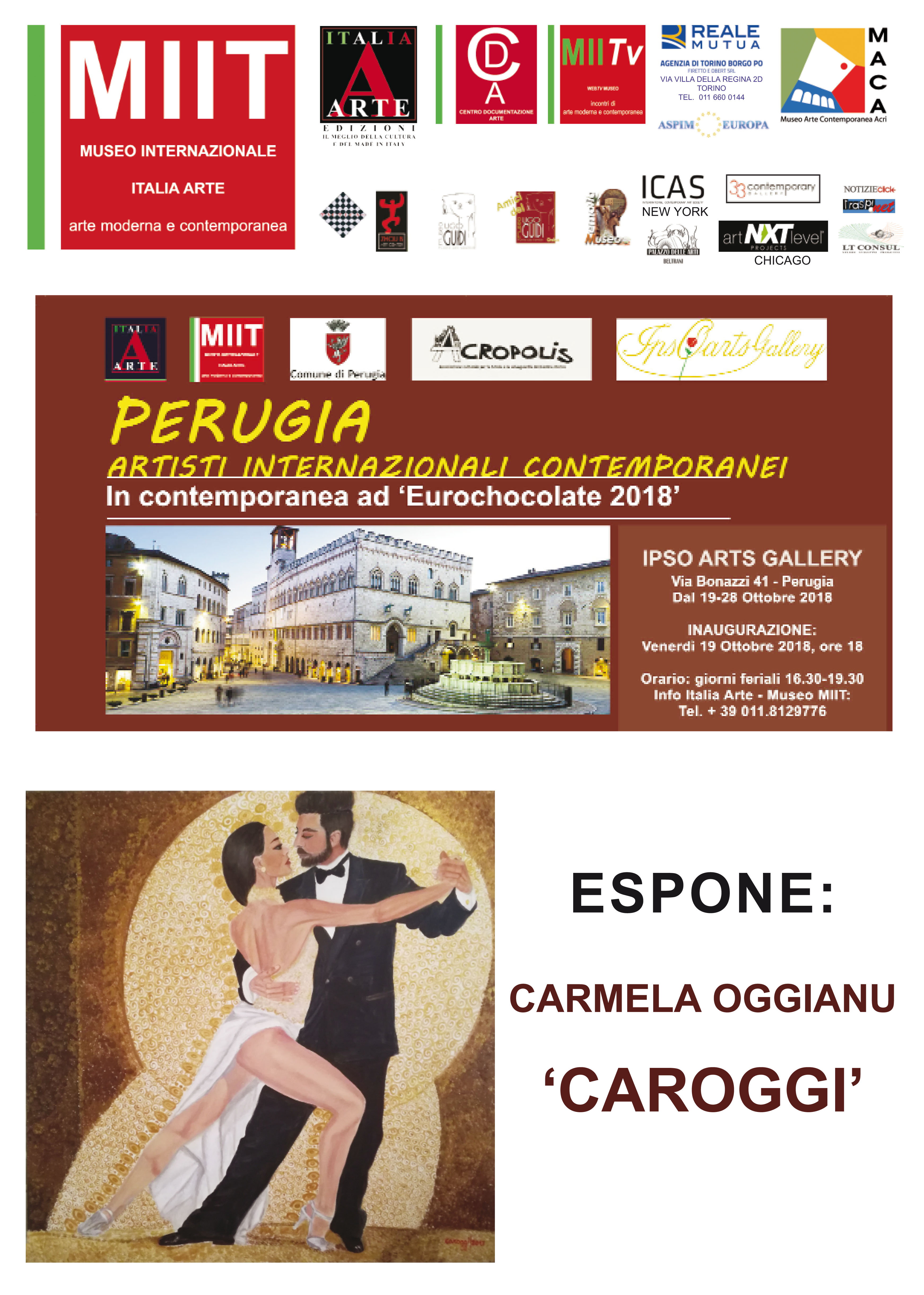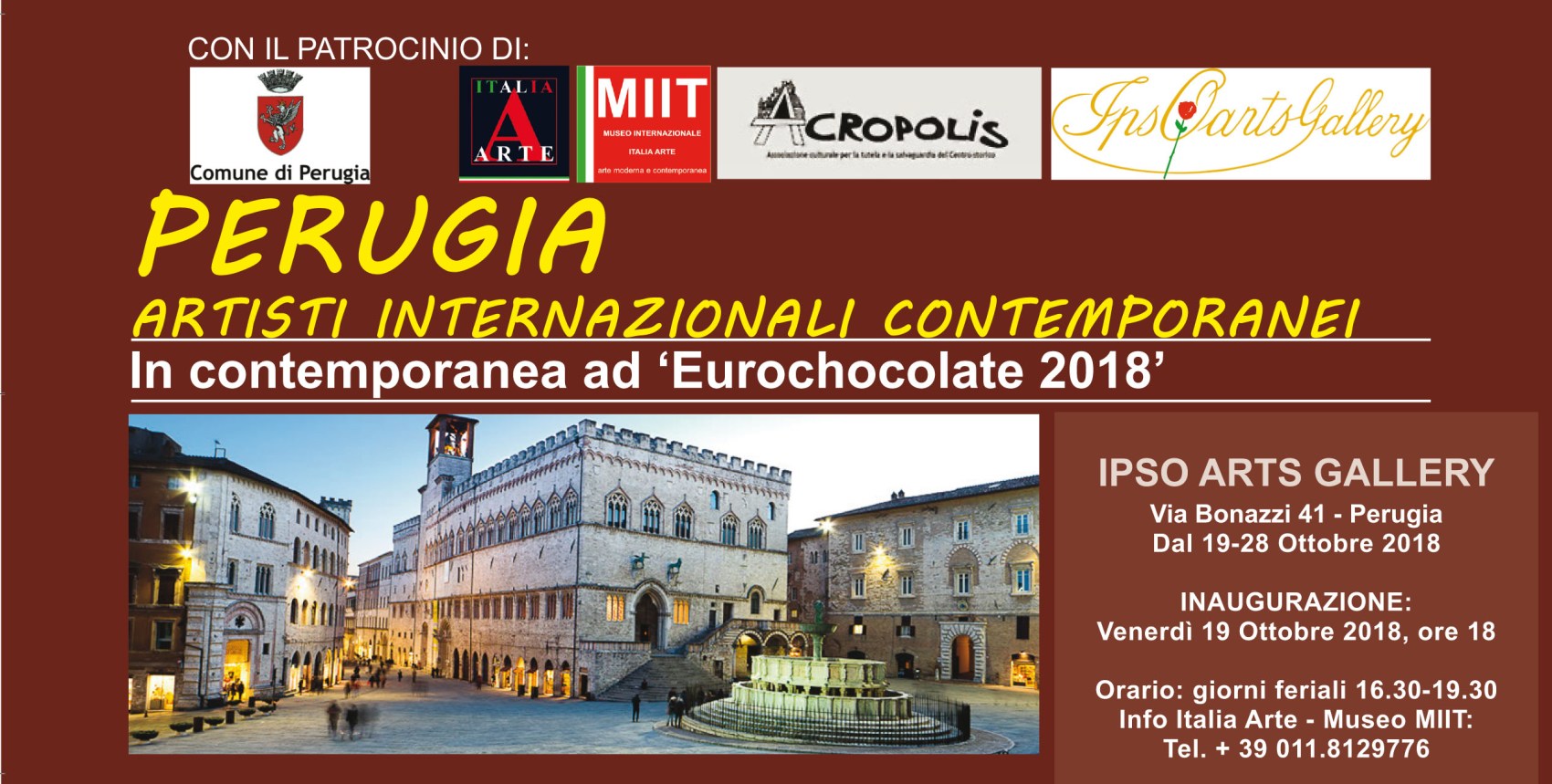 La mostra “Perugia. Artisti Internazionali Contemporanei 2018” verrà inaugurata venerdì 19 Ottobre alle ore 18:00 negli spazi della “Ipso Arts Gallery” e resterà aperta al pubblico fino al 28 Ottobre in orario di galleria (v. Comunicato stampa).
