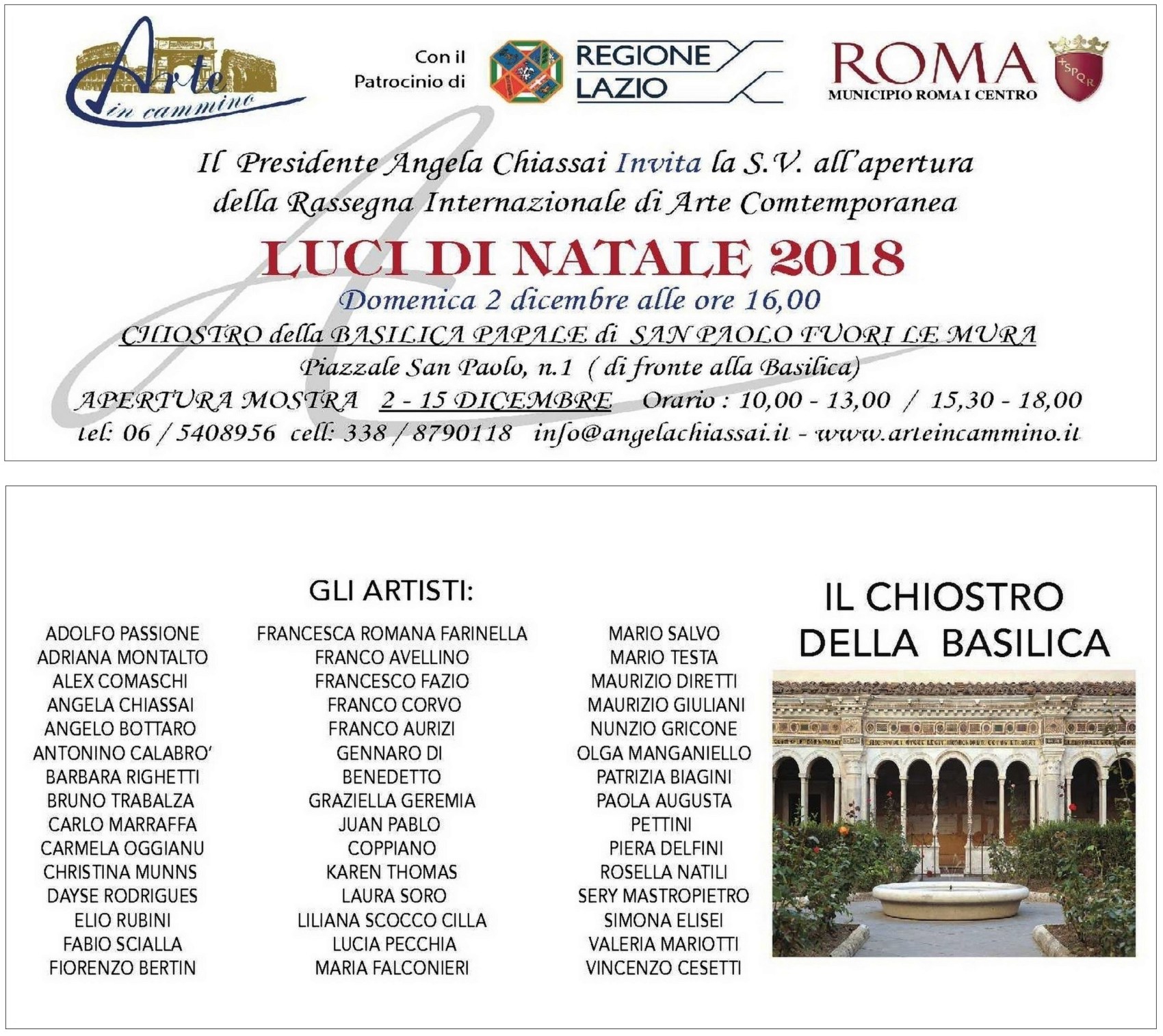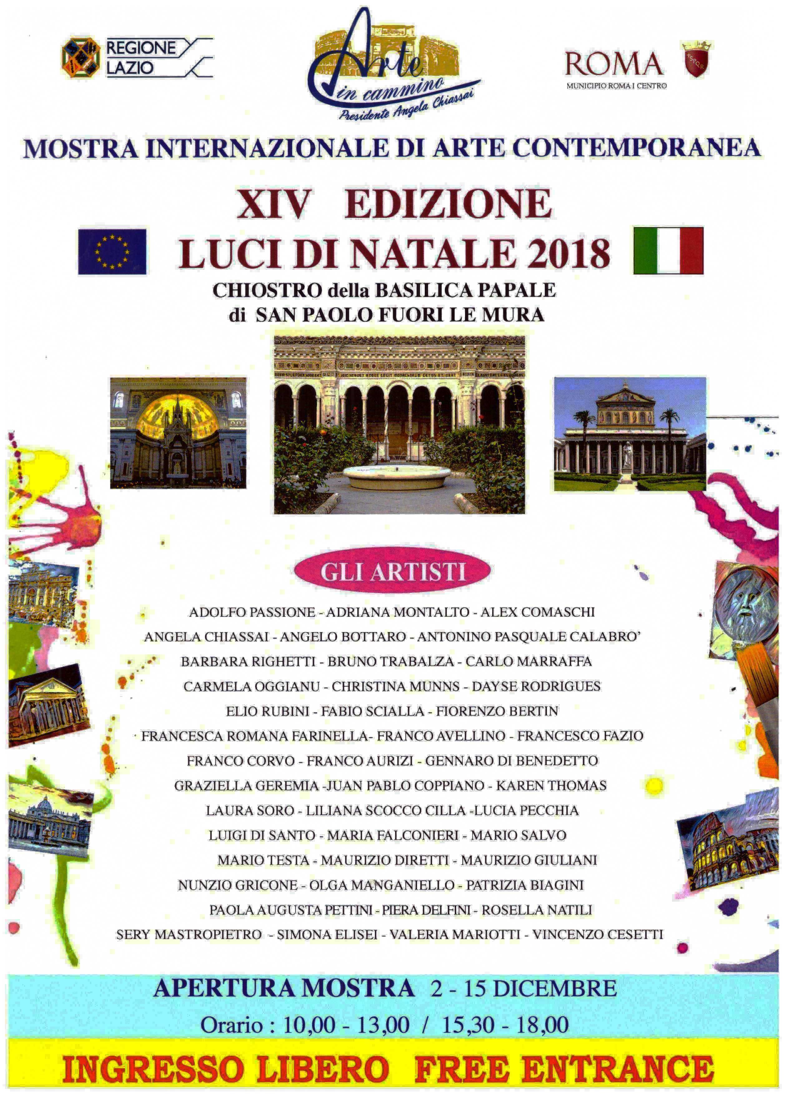 La mostra “Luci di Natale 2018” verrà allestita a Roma nel Chiostro della Basilica di San Paolo fuori le Mura e inaugurata domenica 2 Dicembre alle ore 16:00 alla presenza di critici d’arte, personalità della cultura e alti prelati della Basilica (v. Locandina mostra). Sabato 15 Dicembre alle ore 12.00 ci sarà la chiusura della manifestazione con la consegna degli Attestati di partecipazione e dei Cataloghi.