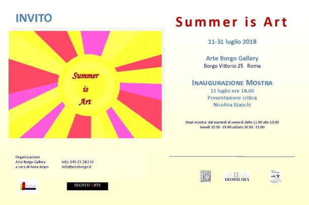 La mostra “Summer is Art” verrà inaugurata alle ore 18:00 di mercoledì 11 Luglio, con presentazione critica di Nicolina Bianchi, negli spazi dell’Arte Borgo Gallery di Roma e resterà aperta al pubblico fino al 31 Luglio in orario di galleria.