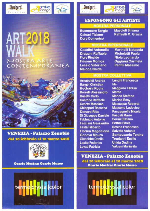 In occasione del Carnevale di Venezia, la mostra “Art Walk 2018” verrà inaugurata alle ore 11:00 di sabato 10 Febbraio nella nota location veneziana di Palazzo Zenobio e resterà aperta al pubblico fino al 10 Marzo in orario di museo.