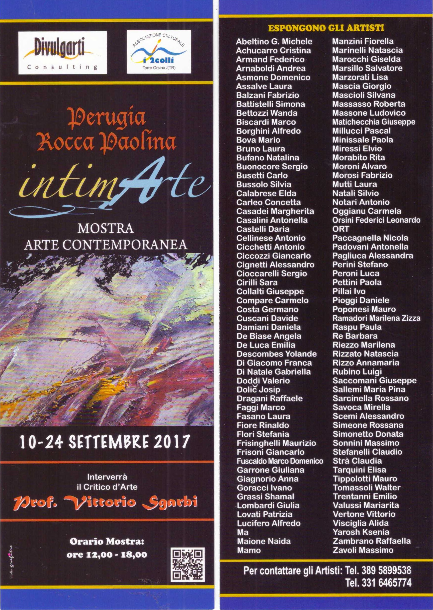 La mostra “IntimArte 2017” verrà inaugurata alle ore 12:00 di domenica 10 Settembre dai critici d’arte prof. Vittorio Sgarbi e dott.ssa Claudia Sensi nella location di Rocca Paolina, sita nel centro storico di Perugia, e resterà aperta al pubblico fino al 24 Settembre (v. Artisti in esposizione).