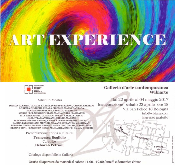 La mostra “Art Experience 2017” verrà inaugurata alle ore 18:00 di sabato 22 Aprile dal critico d’arte dott.ssa Francesca Bogliolo presso la Galleria Wikiarte di Bologna e resterà aperta al pubblico fino al 4 Maggio in orario di galleria (v. Comunicato stampa).