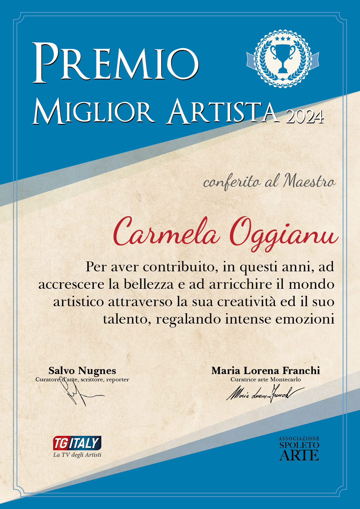 Premio miglior Artista 2024: “Per aver contribuito, in questi anni, ad accrescere la bellezza e ad arricchire il mondo artistico attraverso la sua creatività e il suo talento, regalando intense emozioni”.