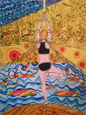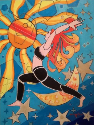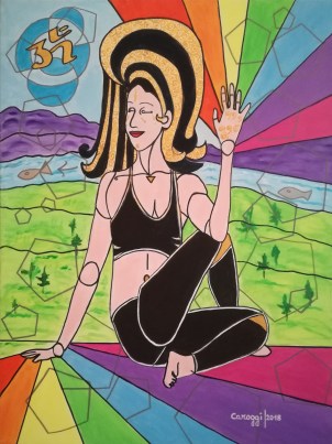 [EN] At the base of the painting is the lake from which emerges a rock. The yogi represents the tree whose roots branch off from the base of the foot in equilibrium penetrating the rock, while the long hair represents the leafy branches of the tree, which extend towards the Universe, represented at the top by the blue and violet colors. The position of the tree (vrksasana) offers a significant symbolic value, as it indicates the need to plant deep roots in the ground, only in this way can one rise towards the sky. The roots anchor to the ground, while the long hair symbolizes the wings to fly and connect upwards. From the hands comes a beam of light that unites the yoga practitioner to the sky.